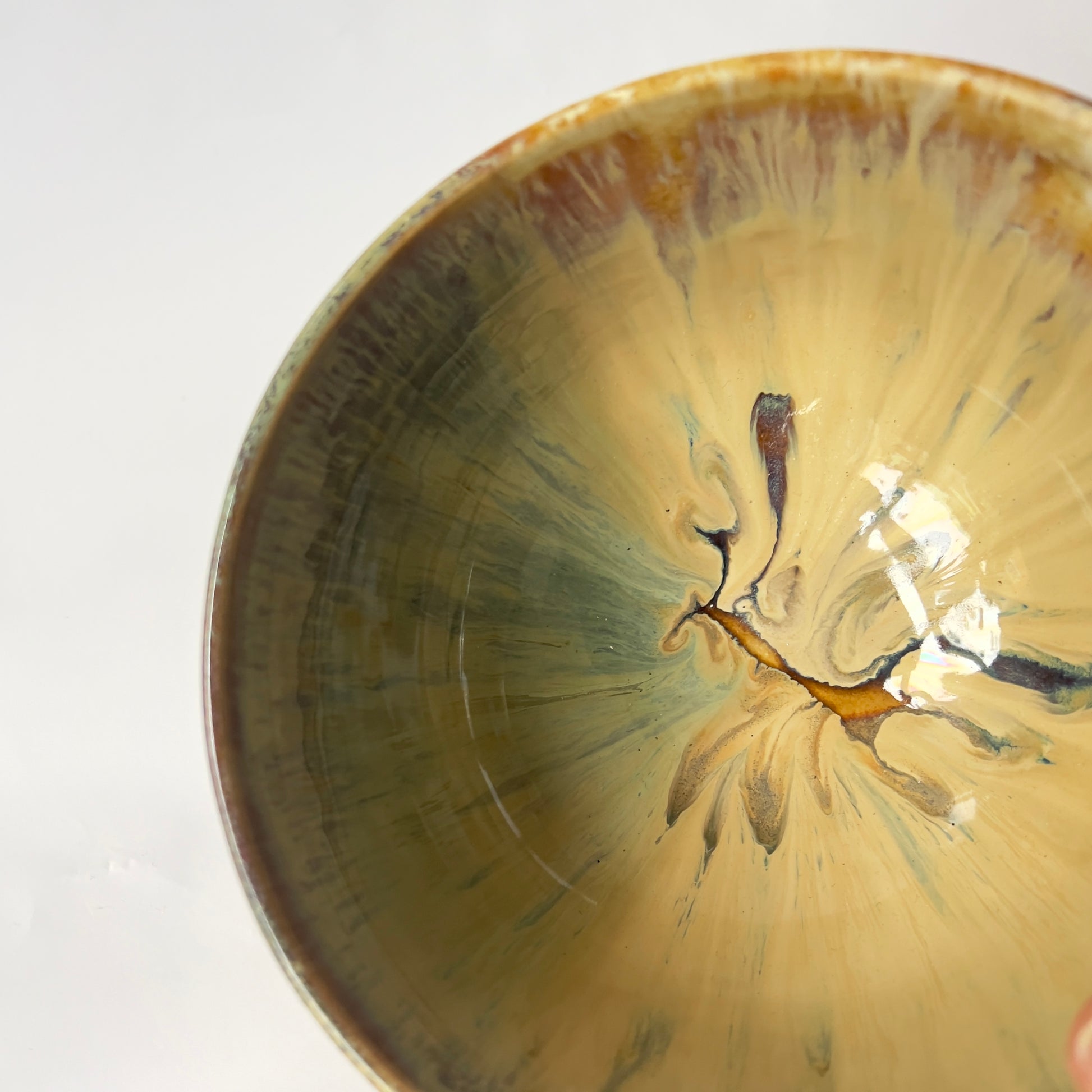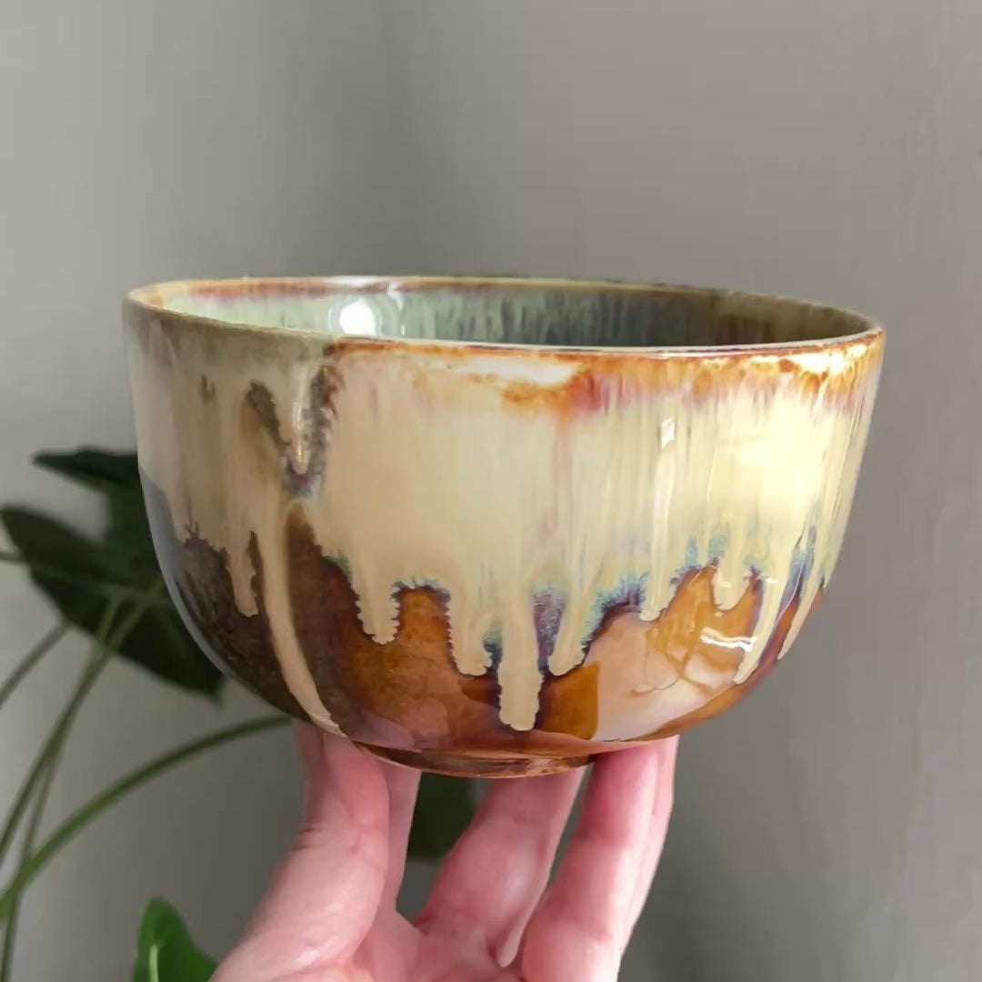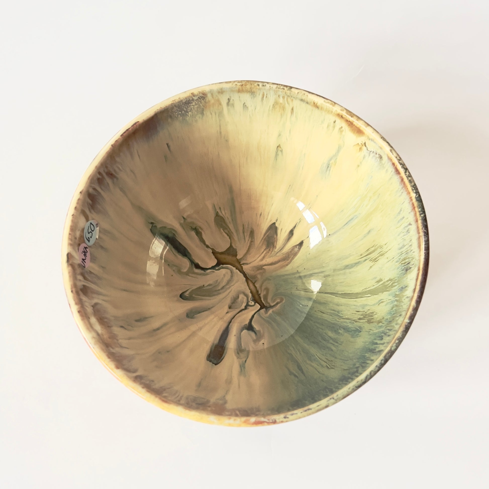 Skålen prydes af en unik glasering i nuancer af brun, beige og grøn, hvor den smukke brune farve elegant løber ned ad siderne. Denne betagende glasur skaber en visuel dybde og karakter, der gør skålen til et absolut blikfang.